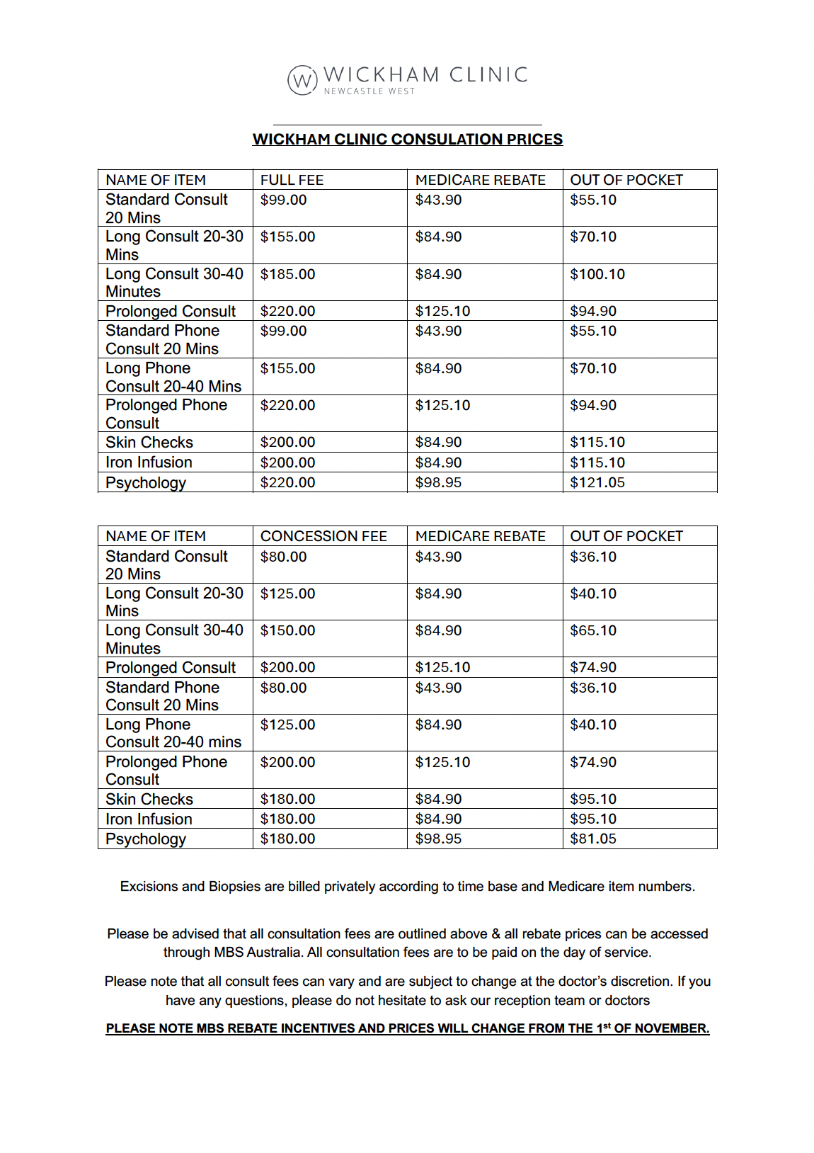Wickham Clinic Consultation Prices